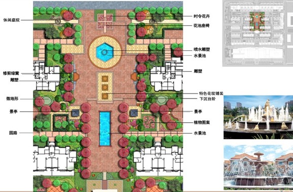 項(xiàng)目考慮“人、自然、空間”之間的和諧關(guān)系,堅(jiān)持以人為本的設(shè)計(jì)理念,在設(shè)計(jì)中以生態(tài)環(huán)境優(yōu)先為原則,充分考慮建筑和景觀之間的關(guān)系,通過材料和造型的運(yùn)用,將歐式建筑和新古典景觀進(jìn)行風(fēng)格樣式上的對(duì)接。在規(guī)劃的同時(shí),輔以景觀設(shè)計(jì),最大限度的體現(xiàn)居住區(qū)本身的底蘊(yùn)。設(shè)計(jì)中結(jié)合當(dāng)?shù)靥厣谛^(qū)中設(shè)置小區(qū)中心景觀軸線、橫向景觀帶、生態(tài)種植區(qū)等。在中心景觀軸線當(dāng)中設(shè)置了歐式的矮墻噴泉、花溪疊瀑、下層廣場、噴泉水景等,使居民樂居其中。規(guī)劃設(shè)計(jì)注重園林景觀的可參與性,在小區(qū)內(nèi)設(shè)置開闊的硬質(zhì)景觀,如波紋鋪地、琴韻廣場等。小區(qū)內(nèi)公共空間、私密、半私密空間如:下層廣場和健康步道兩者的公共性和私密性設(shè)計(jì)對(duì)比強(qiáng)烈,動(dòng)靜結(jié)合。通過不同的景觀設(shè)計(jì),也為小區(qū)居民提供空間上充足、多樣的休閑、交往、活動(dòng)場地,營造和諧、友善、溫馨的人際關(guān)系氛圍。